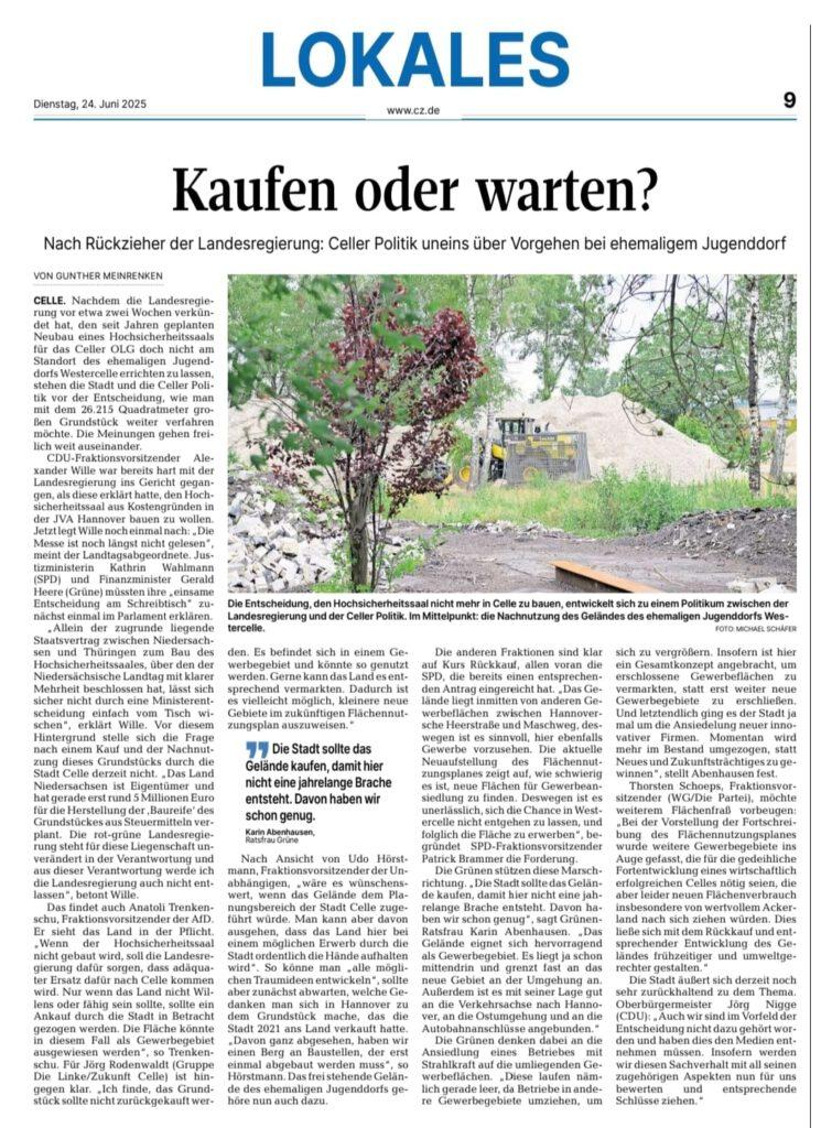 „Bei der Vorstellung der Fortschreibung des Flächennutzungsplanes wurden weitere Gewerbegebiete ins Auge gefasst, die für die gedeihliche Fortentwicklung eines wirtschaftlich erfolgreichen Celles nötig seien, die aber leider neuen Flächenverbrauch insbesondere von wertvollem Ackerland nach sich ziehen würden. Dies ließe sich mit dem Rückkauf und entsprechender Entwicklung des Geländes frühzeitiger und umweltgerechter gestalten.“, so Ratsherr Torsten Schoeps.
