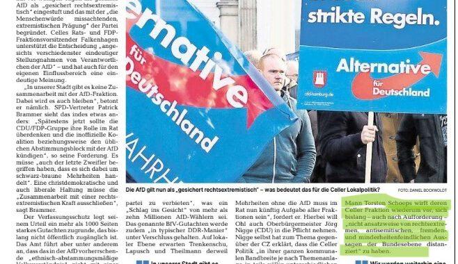 Auf lokaler Ebene wird sich für uns nichts ändern – in der Stadt- und Kommunalpolitik haben wir und werden wir nicht mit der AfD zusammenarbeiten. Eine Zusammenarbeit, selbst mit einer „Verdachtspartei“, verbietet sich – zumal sich die Celler Protagonisten der AfD bislang – auch nach Aufforderung – nicht ansatzweise von rechtsextremen, antisemitischen, fremden- und minderheitenfeindlichen Aussagen der Bundesebene distanziert haben.